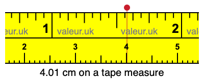 To show you 4.01 centimeters (cm) on our tape measure, we first stretched out our tape measure and then marked 4.01 cm with a red line and a red dot. Here is 4.01 cm on a tape measure: