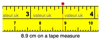 To show you 8.9 centimeters (cm) on our tape measure, we first stretched out our tape measure and then marked 8.9 cm with a red line and a red dot. Here is 8.9 cm on a tape measure: