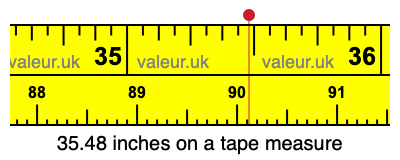 To show you 35.48 inches on our tape measure, we first stretched out our tape measure and then marked 35.48 inches with a red line and a red dot. Here is 35.48 inches on a tape measure:
