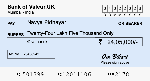 The image below shows you how to write a cheque for 24.05 lakh rupees using both the numeric form and the word form of 24.05 lakh. As you can see, the sample cheque is made out to Navya Pidhayar and signed by Om Bihari.