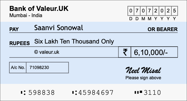 The image below shows you how to write a cheque for 6.1 lakh rupees using both the numeric form and the word form of 6.1 lakh. As you can see, the sample cheque is made out to Saanvi Sonowal and signed by Neel Misal.